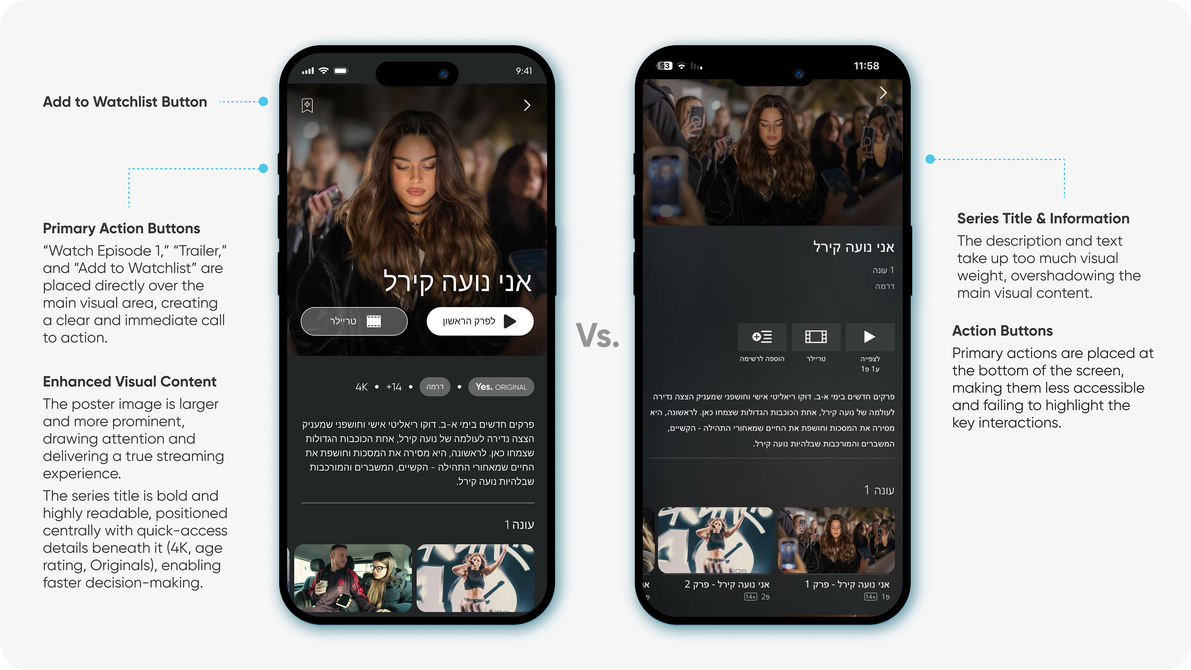 Primary action buttons, “Watch Episode 1,” “Trailer,” and “Add to Watchlist”, are now placed directly over the main visual area, creating a clear and immediate call to action.