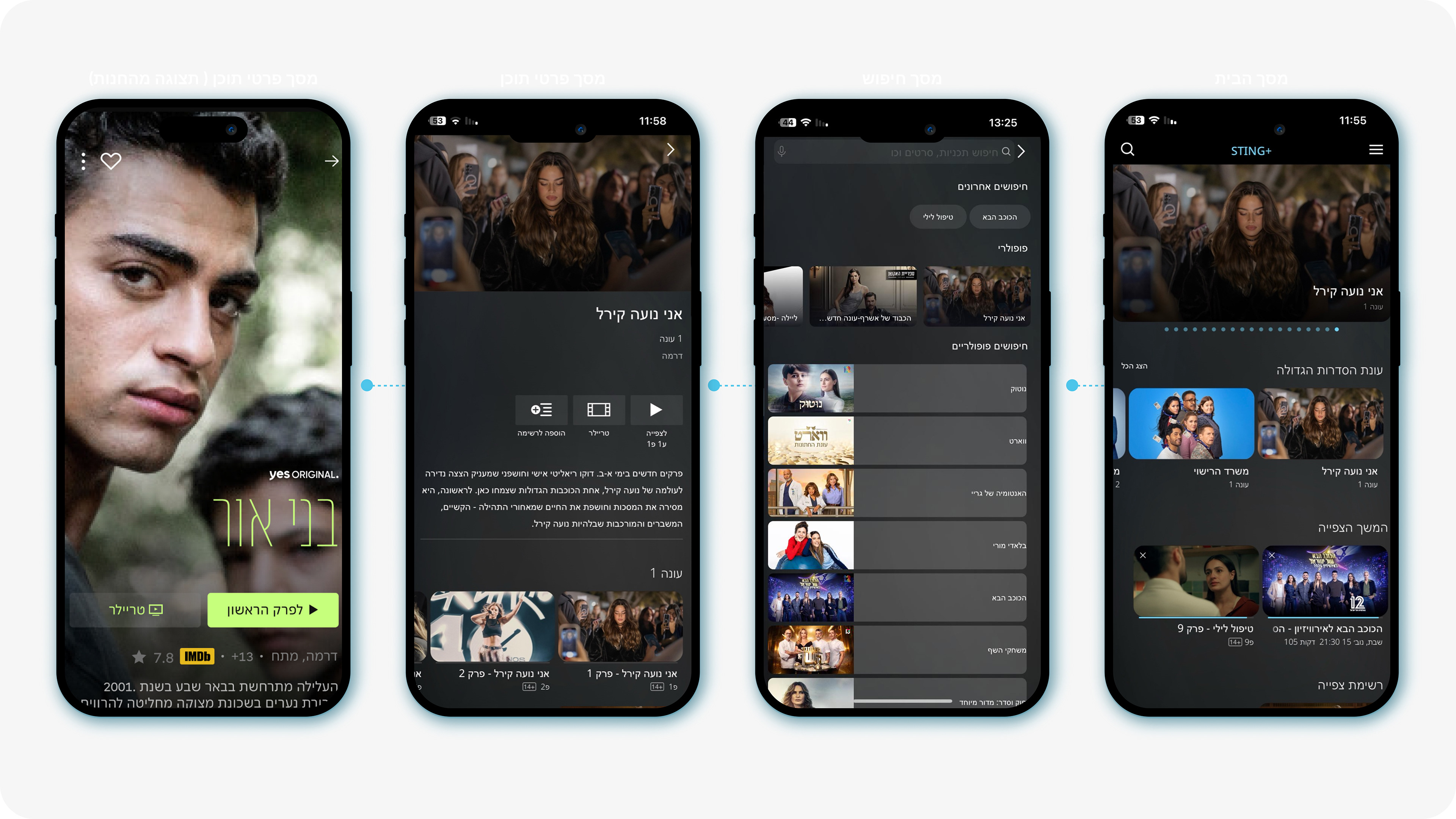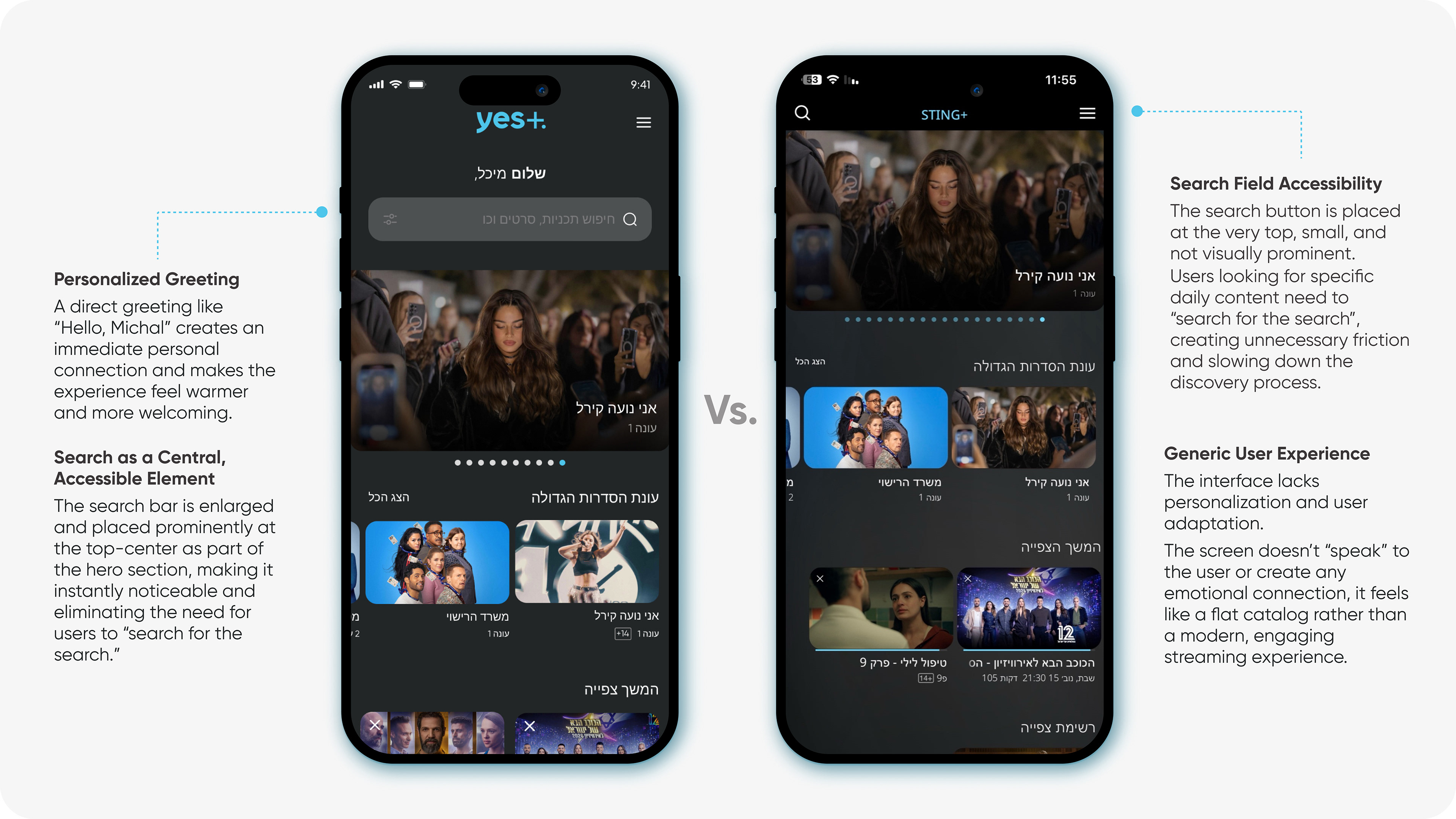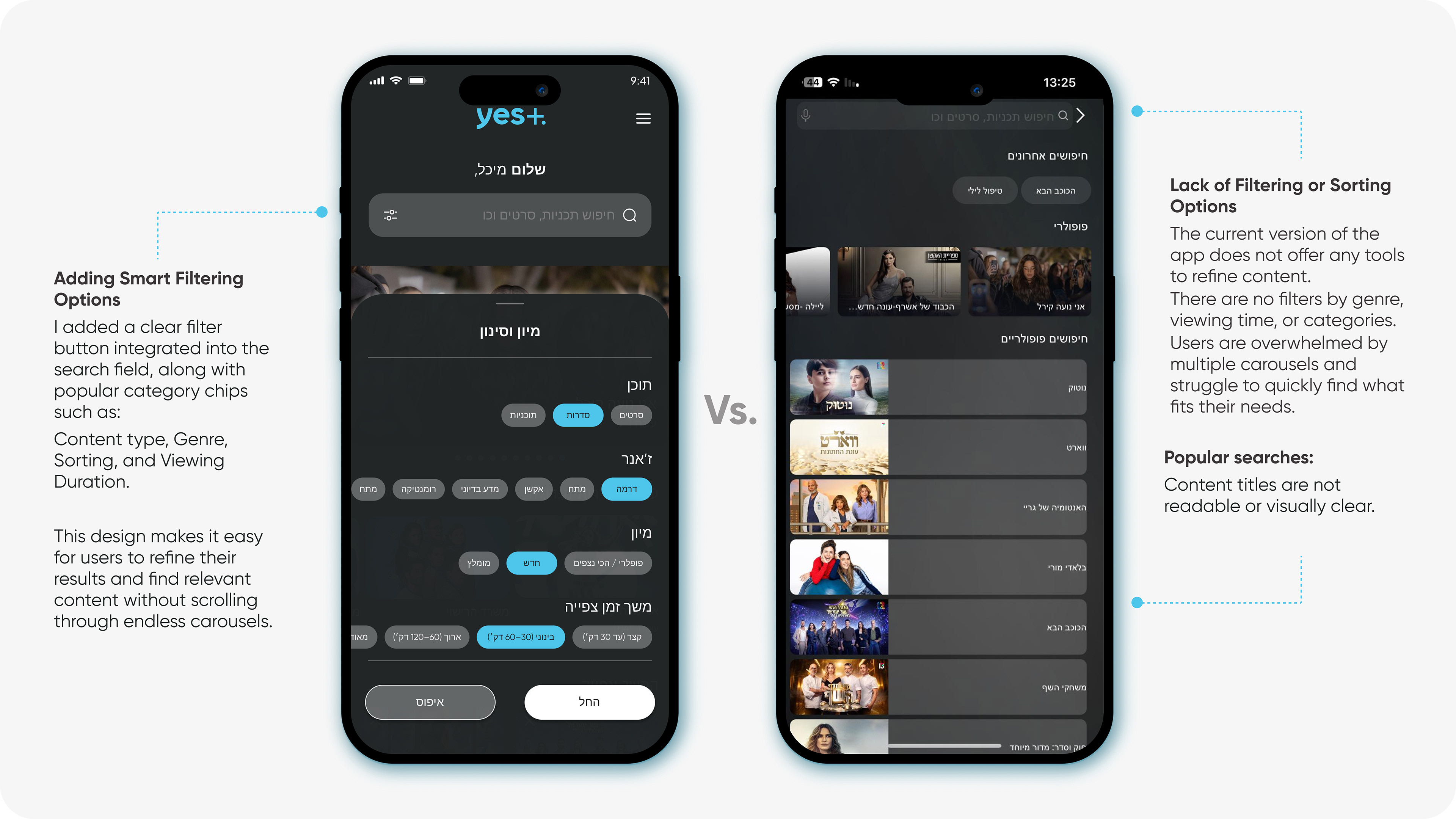 "yes+" is a leading Israeli streaming platform by yes. The goal of this UX/UI redesign was to enhance the content discovery experience — helping users find what to watch quickly, effortlessly, and enjoyably. I analyzed the existing app, identified friction points in navigation and hierarchy, and proposed a smoother, more personalized experience.